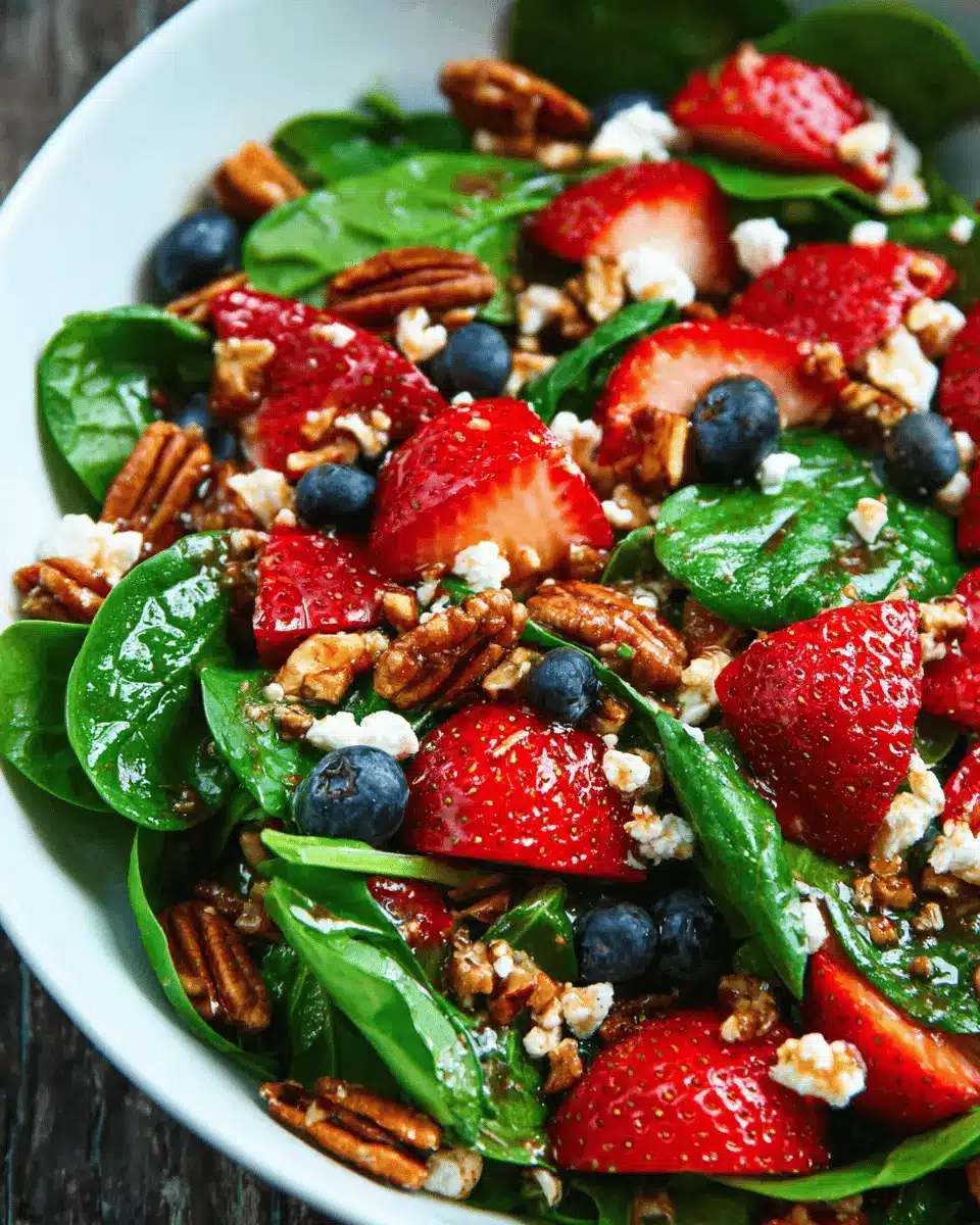 The finishing touches are key! Top each bowl with a healthy sprinkle of whole and chopped toasted pecans; these will provide that satisfying crunch that contrasts wonderfully with the soft spinach and juicy berries. Finally, drizzle your homemade balsamic glaze generously across the top. Don’t skimp here—the glaze is what ties all these delicious elements together and adds that extra layer of flavor.
