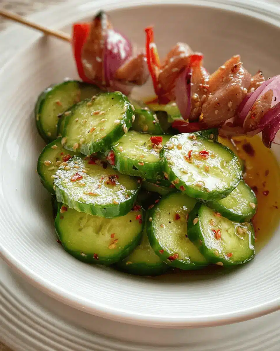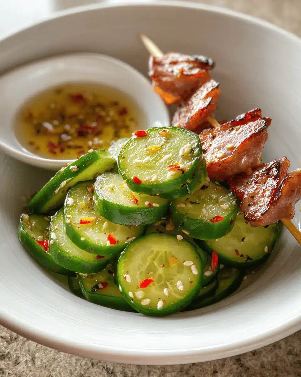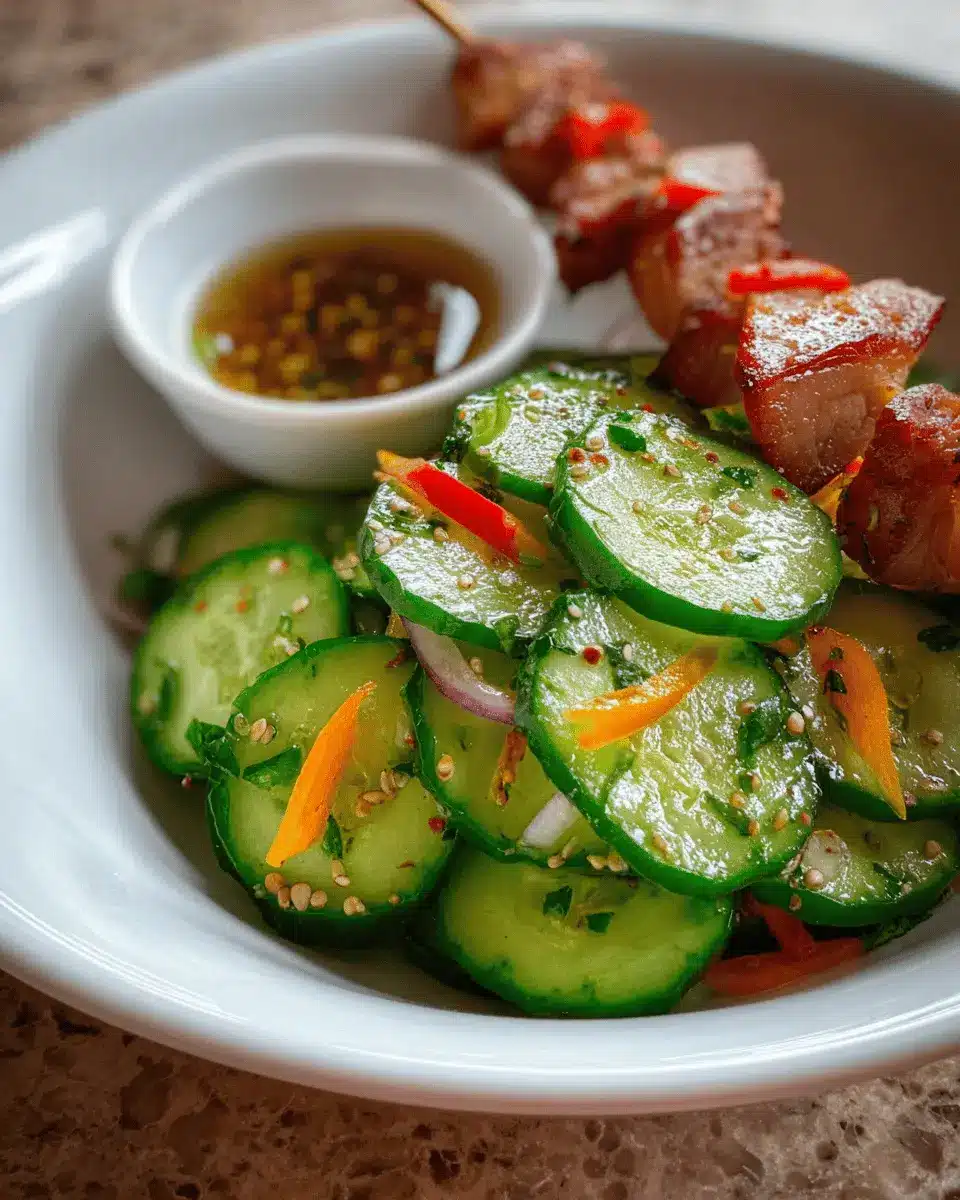 Looking to elevate your Asian Cucumber Salad experience? This refreshing dish pairs wonderfully with grilled proteins like chicken, shrimp, or even teriyaki tofu. Consider serving it alongside a warm bowl of jasmine rice for a satisfying meal. Additionally, for a delightful crunch, serve it with sesame crusted tuna or spicy turkey bacon for an unexpected twist.