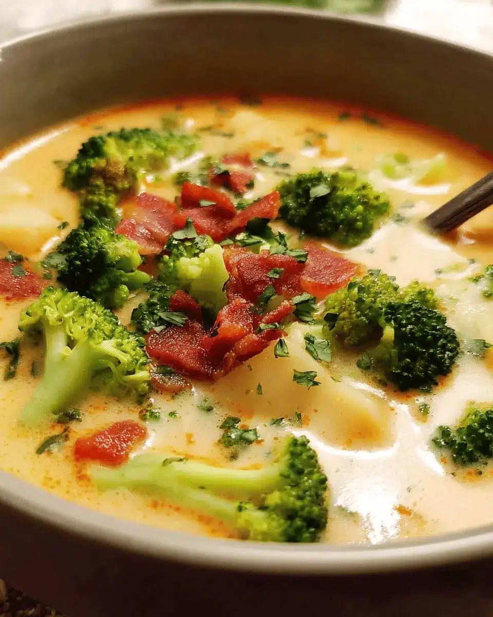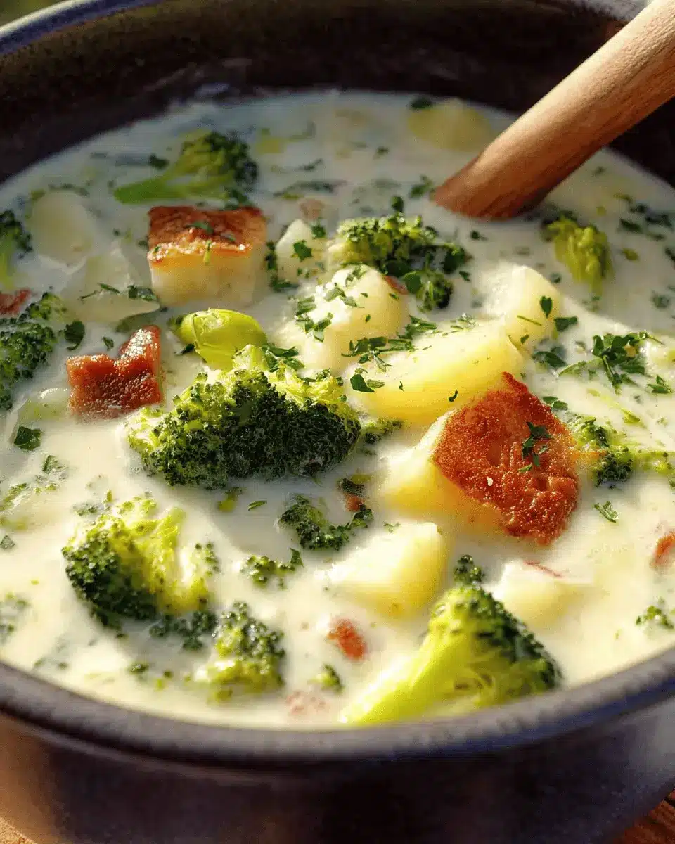 Serving your broccoli and potato soup can be just as fun as making it! Consider ladling the soup into hollowed-out bread bowls for a rustic presentation. Alternatively, swirl in a splash of olive oil or a dollop of pesto before serving for a flavorful twist. For garnish, crispy turkey bacon bits or a sprinkle of fresh herbs like chives or parsley can add texture and color.