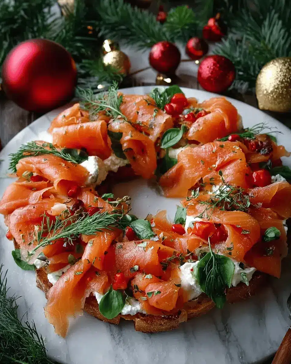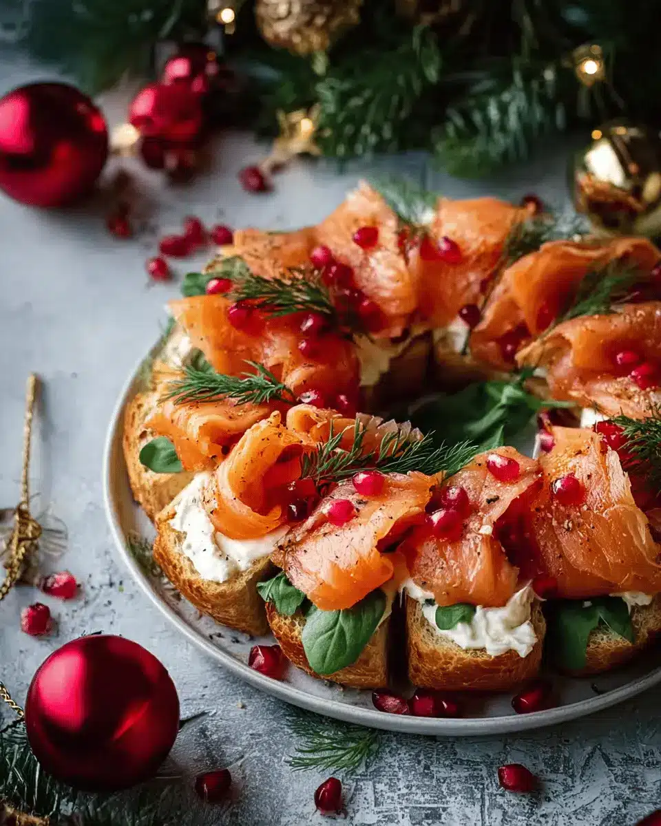 While our Christmas Bruschetta Wreath with Smoked Salmon is undeniably delicious, consider switching things up with alternative toppings! For a different flavor profile, try using turkey bacon and chicken ham instead of salmon. Roasted red peppers, sautéed mushrooms, or even a spread of tangy goat cheese can add a delightful zest. Experiment with fig or apricot preserves in place of honey for a sweet twist.