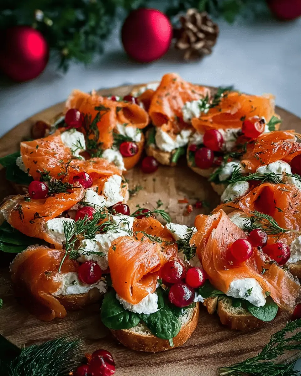The Christmas Bruschetta Wreath is not just an appetizer; it's a mouthwatering centerpiece that brings festive cheer to your holiday gatherings. Picture this: a ring of perfectly toasted baguette slices, each adorned with creamy cheeses, succulent smoked salmon, and vibrant, fresh ingredients like tomatoes and basil. Drizzled with sweet honey and fig jam, this wreath delivers a delightful blend of flavors and textures that will elevate any festive table.
