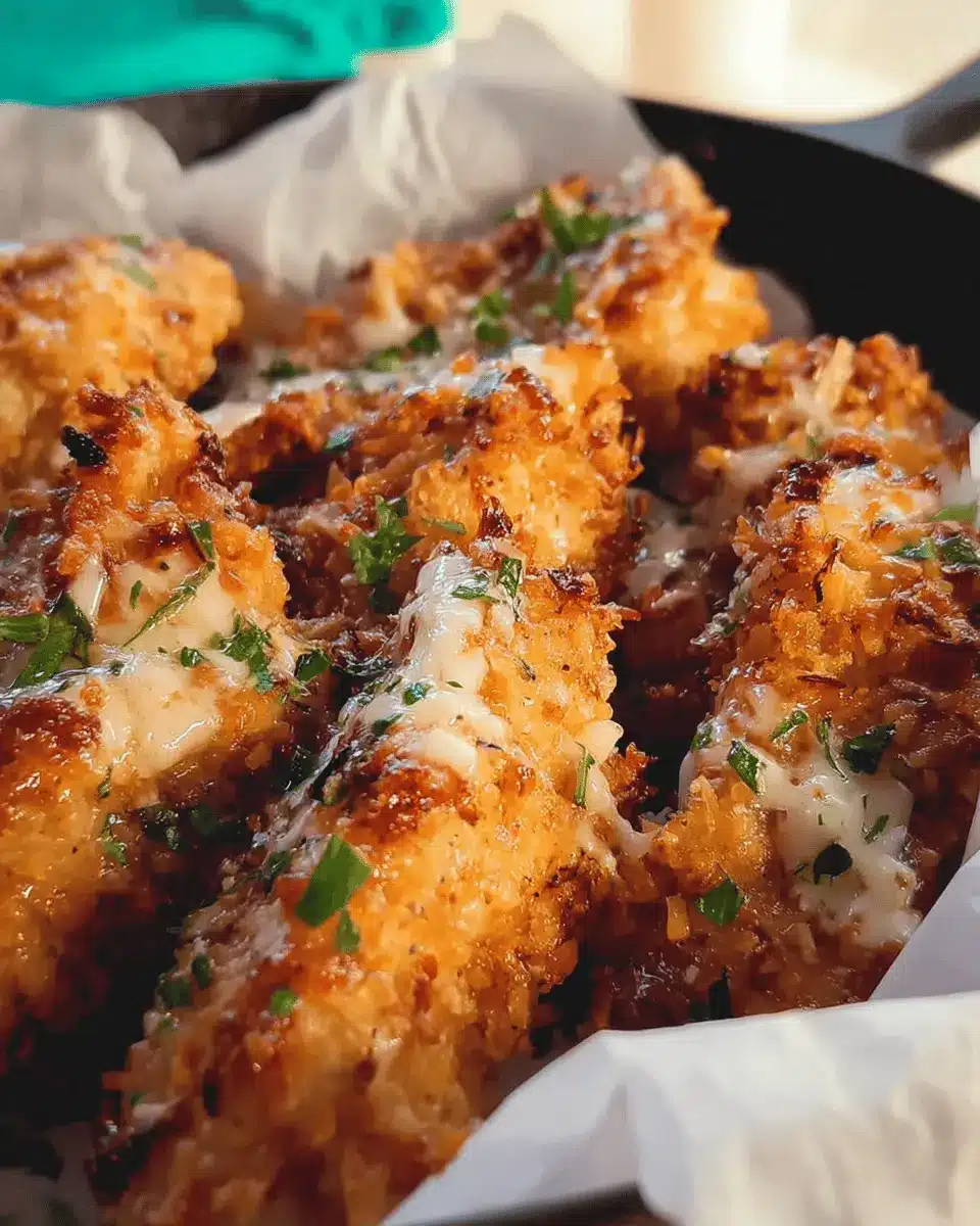 Time for the moment of truth—baking! Place the coated chicken strips in your preheated oven and bake for about 30 minutes. Keep an eye on them; you want them golden brown and cooked through. For a delightful finishing touch, mix the reserved coconut milk with some mayonnaise in a small saucepan. Heat it over medium-low until it simmers; this will be your creamy dipping sauce. Serve your Coconut Chicken hot and crispy, either drizzled with the sauce or on the side for dipping.