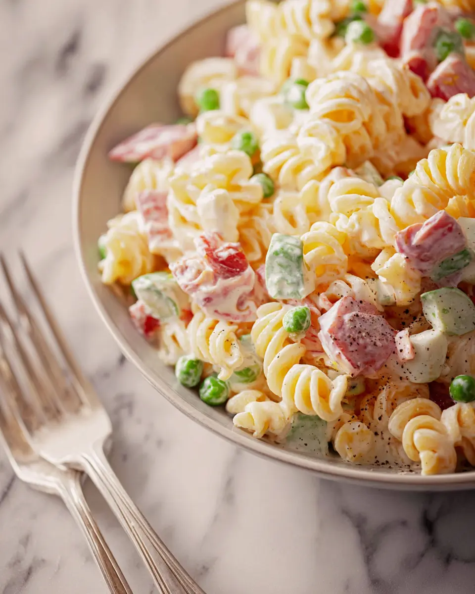 Creamy Pasta Salad with Chicken Ham and Turkey Bacon