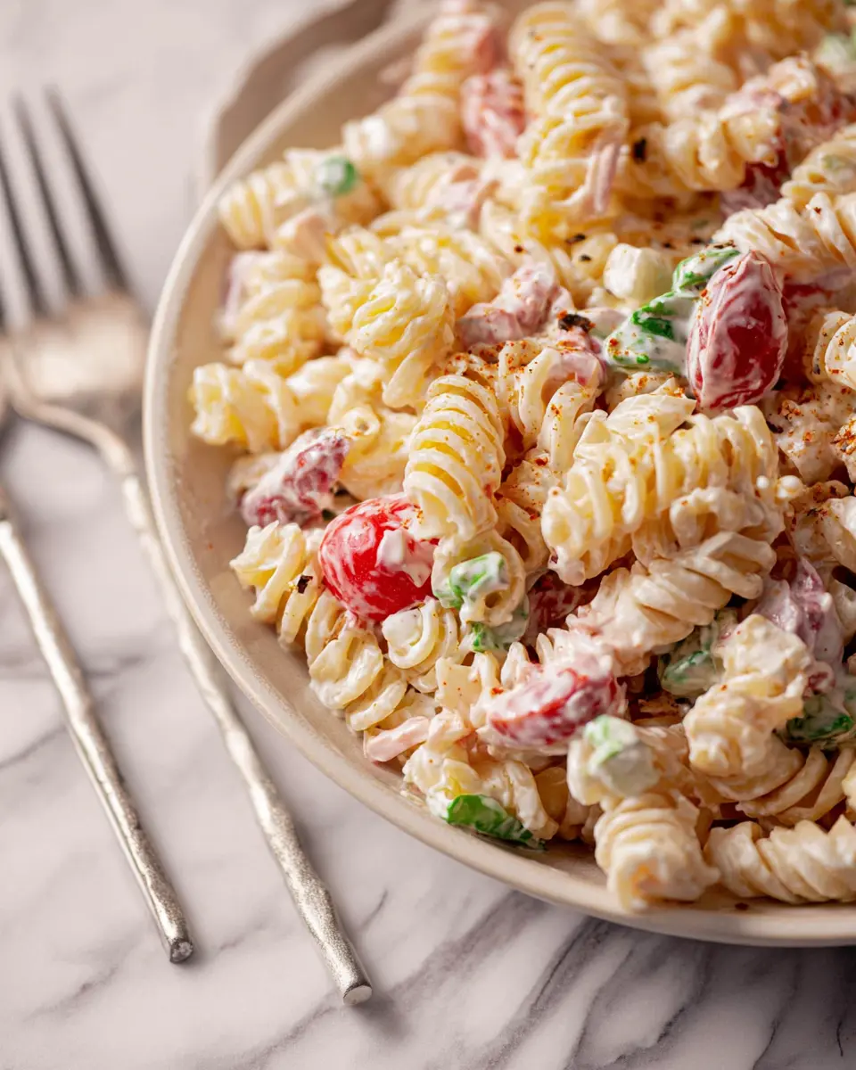 Imagine gathering your family or friends around a bowl of this creamy delight, filled with colorful vegetables and hearty pasta, all coated in a rich mayo and sour cream dressing. It’s a crowd-pleaser that not only tastes fantastic but is also highly customizable. You can easily swap in your favorite proteins like chicken ham or turkey bacon, or bulk it up with fresh greens if you're craving something even lighter.