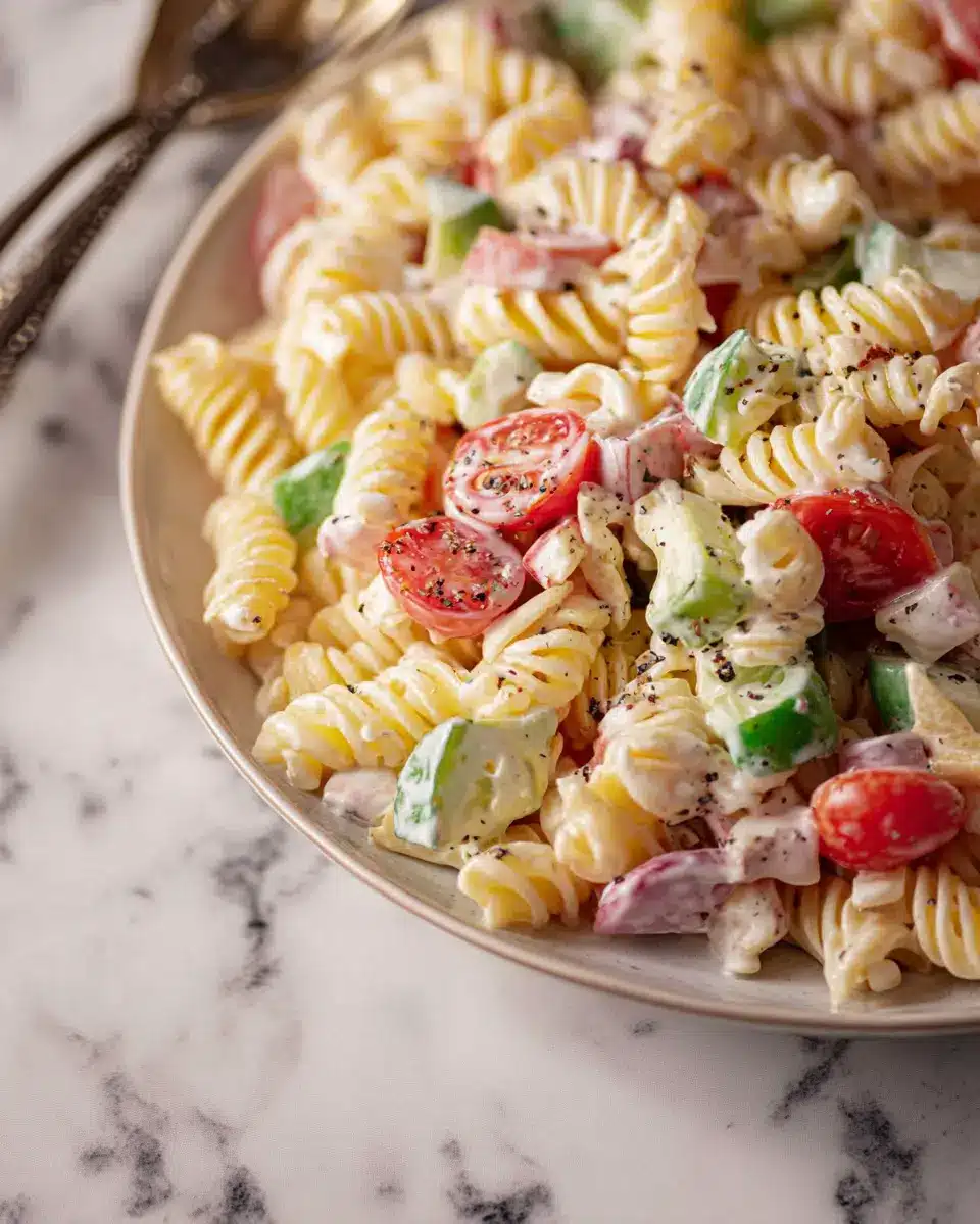 Right before you serve, give the salad a good stir. Taste it one last time—maybe it needs a little extra salt or some more pepper. If the pasta absorbed a bit of the dressing while chilling, add a drizzle of olive oil or a touch of vinegar to bring it back to life. Now, you’re ready to enjoy this creamy, refreshing dish! It’s sure to be a hit with friends and family alike.
