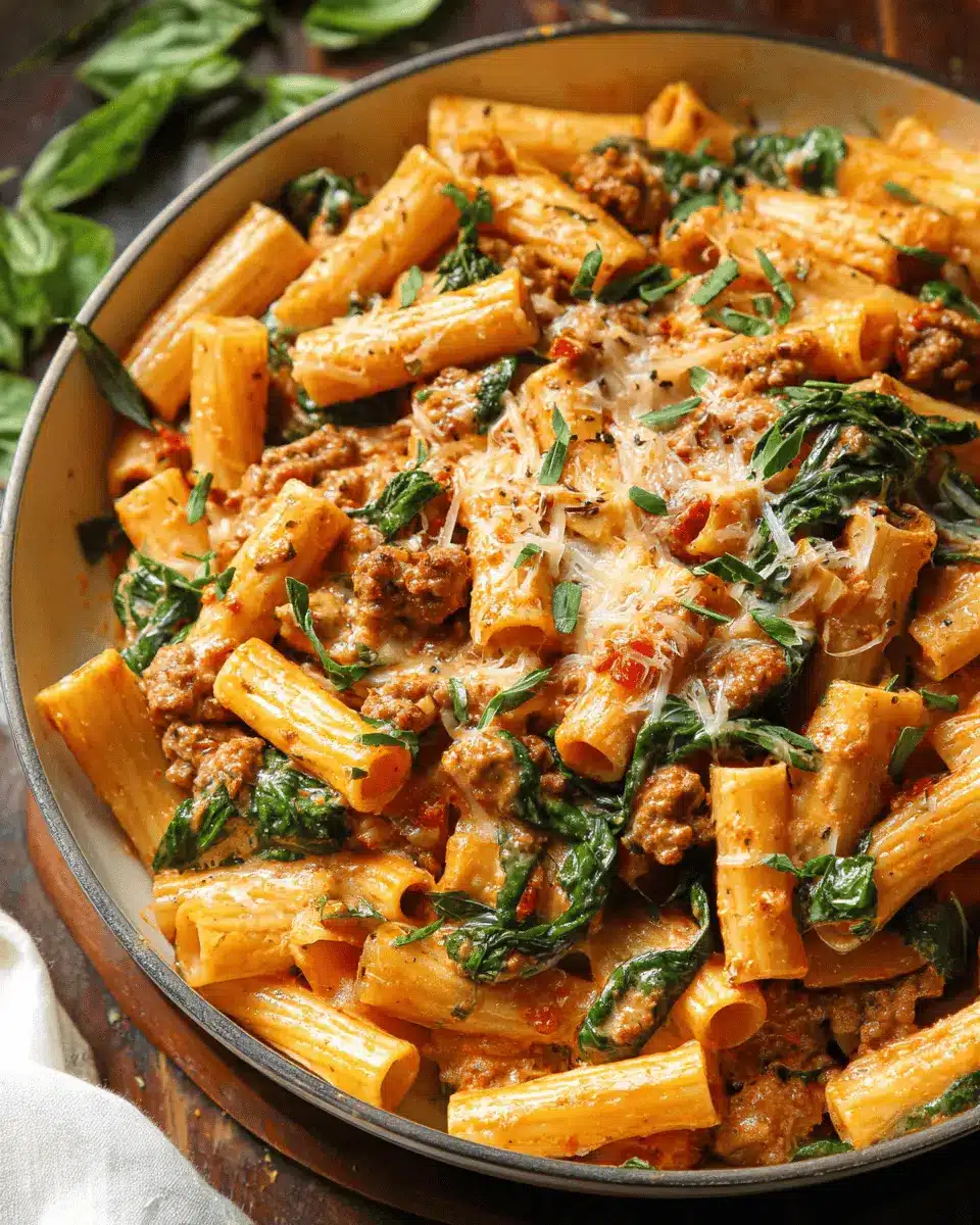 Get a little adventurous when plating your creamy sausage rigatoni! Serve it in bowls topped with a sprinkle of grated Parmesan cheese and fresh basil. For a fun twist, try adding a poached egg on top for extra creaminess. You can even layer it in a casserole dish, sprinkle with breadcrumbs, and bake it for a bubbly, cheesy delight. Don’t forget to garnish with fresh herbs for a pop of color and flavor!