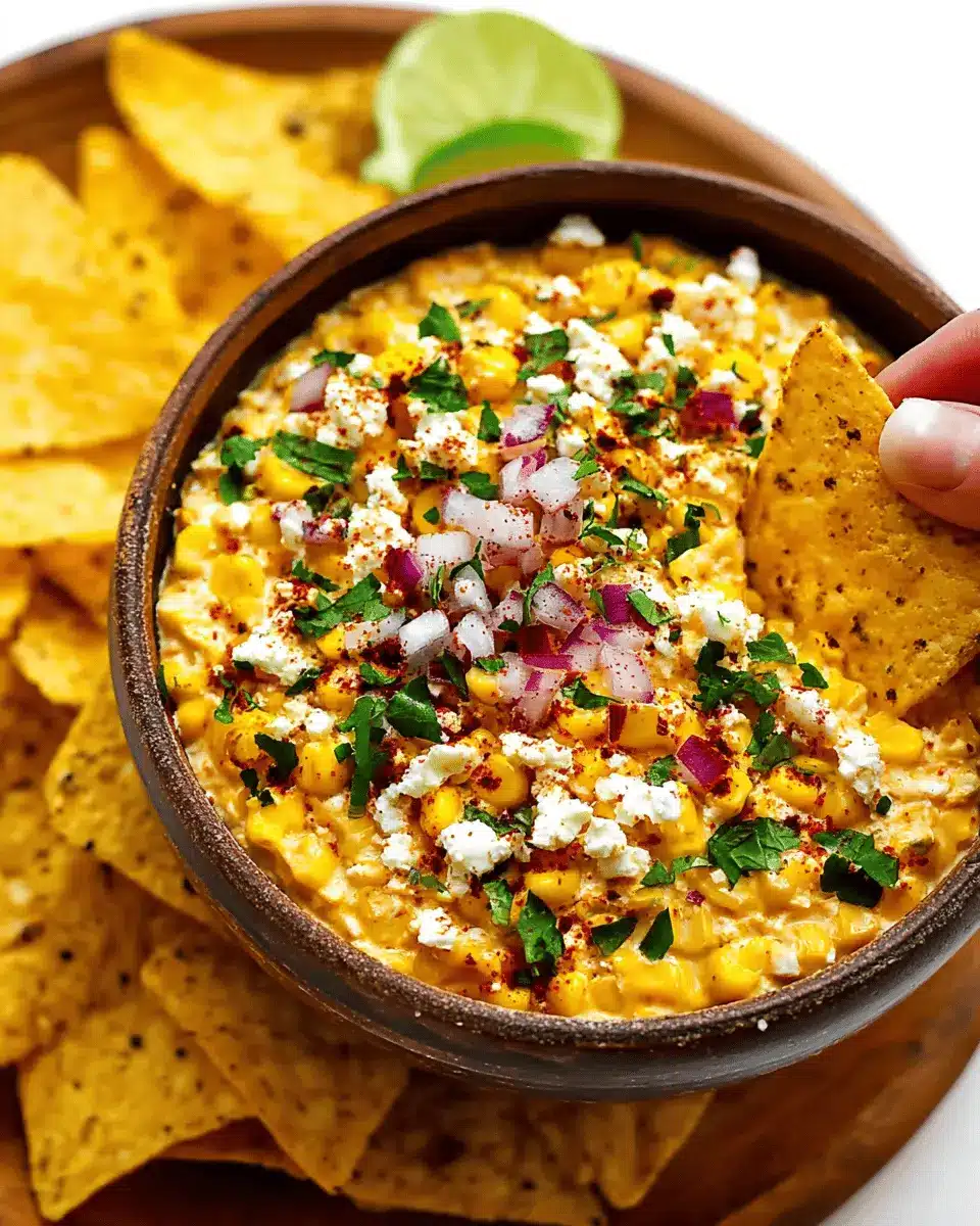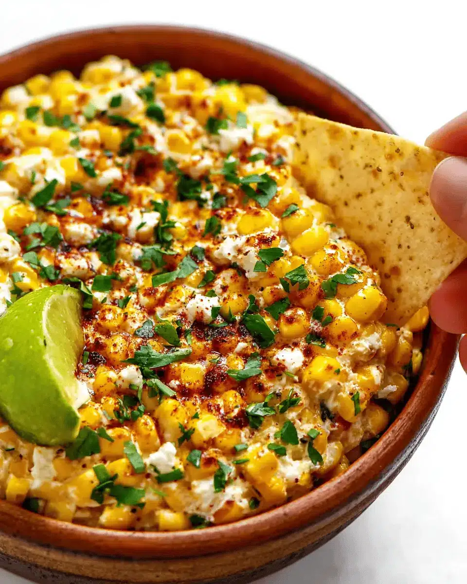 The best part about easy elote dip is its versatility! Serve it with crispy tortilla chips for that perfect crunch or sliced veggies like bell peppers and cucumbers for a fresh, healthy twist. The sweetness of the corn and the tangy lime will elevate any snack spread, making it a hit at casual movie nights or game day gatherings.