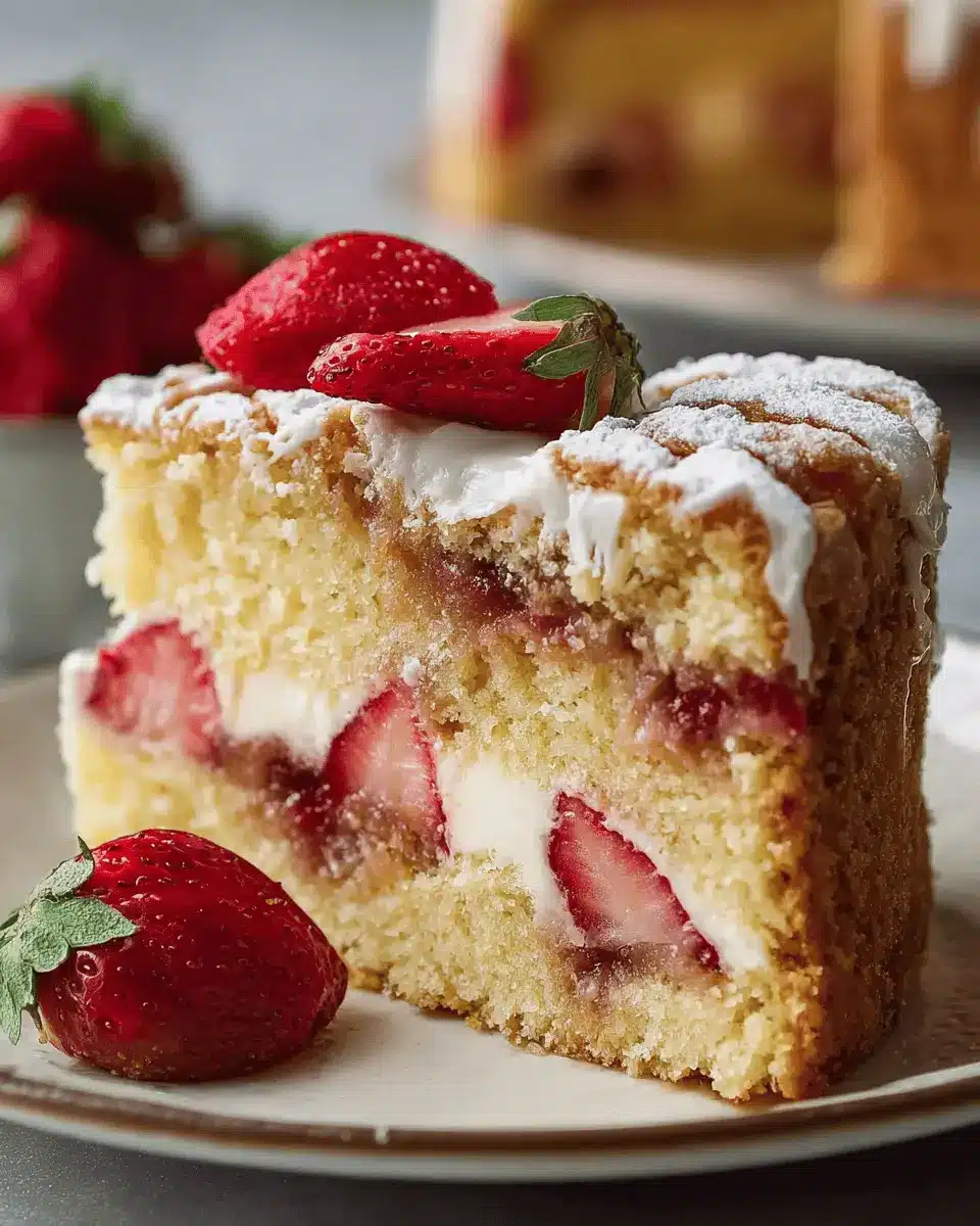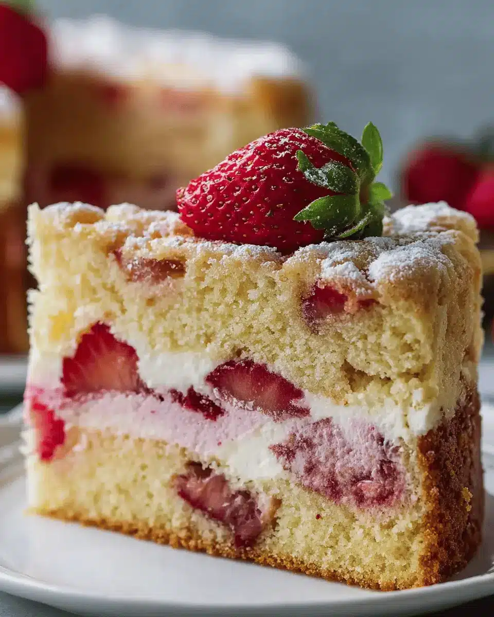 To prevent your strawberries from sinking to the bottom of the cake, consider tossing them in a bit of flour before folding them into the batter. This light coating helps them stay suspended while baking, allowing for beautiful bursts of berry flavor throughout the cake. Enjoy a slice topped with fresh strawberries for an extra touch!
