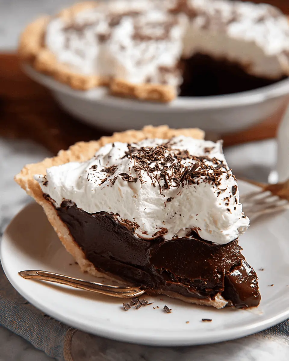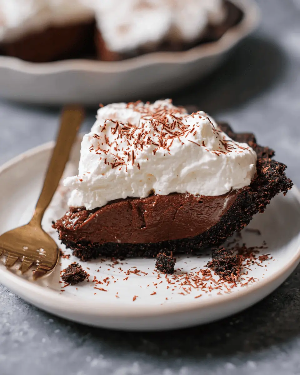Just before serving, whip up ¾ cup of heavy cream with confectioners’ sugar and vanilla extract until those medium peaks form. This light and airy topping adds an incredible contrast to the rich chocolate pie. Spoon or pipe the whipped cream generously over the pie, and finish it off with chocolate shavings using a vegetable peeler.