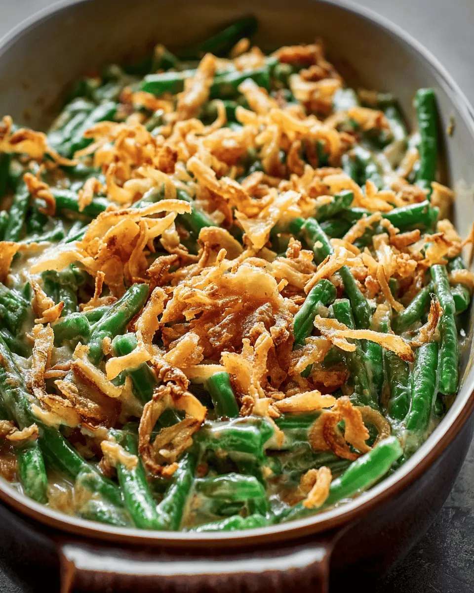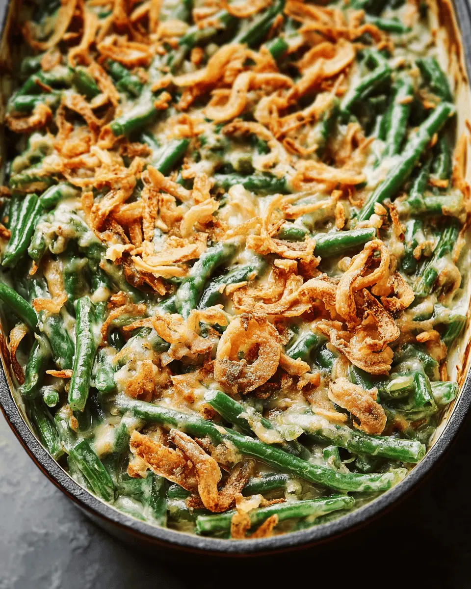 Finally, we can’t forget the crowning glory: that crispy topping! Remove the casserole from the oven and give the beans a little stir to redistribute the deliciousness. Sprinkle 1 ½ cups of French fried onions on top. These will add that beloved crunch we all look forward to. Return the casserole to the oven for another 10 minutes, or until the onions are golden brown. When you finally pull it out, you’ll have a beautiful, bubbling green bean casserole that’s just begging to be devoured!