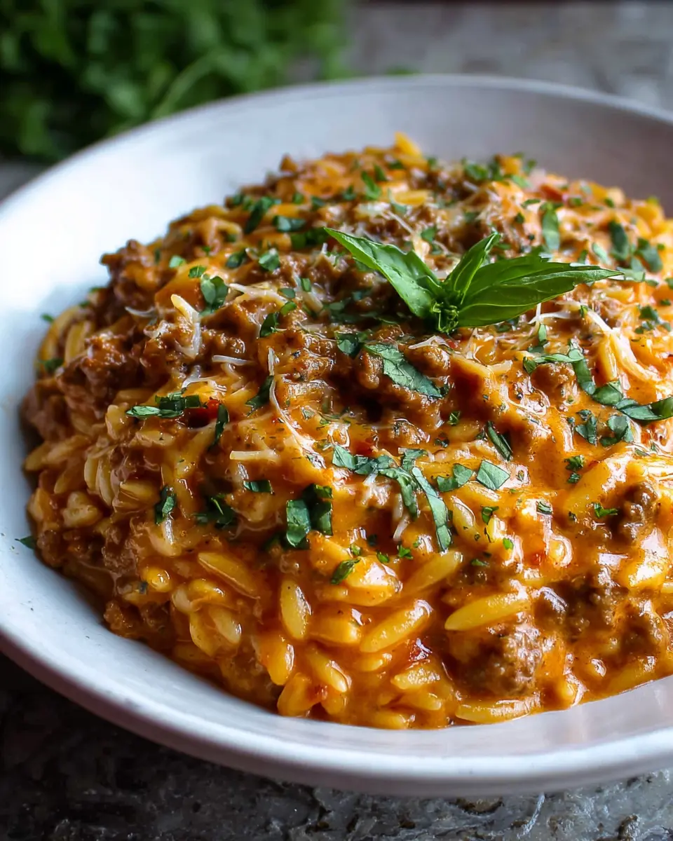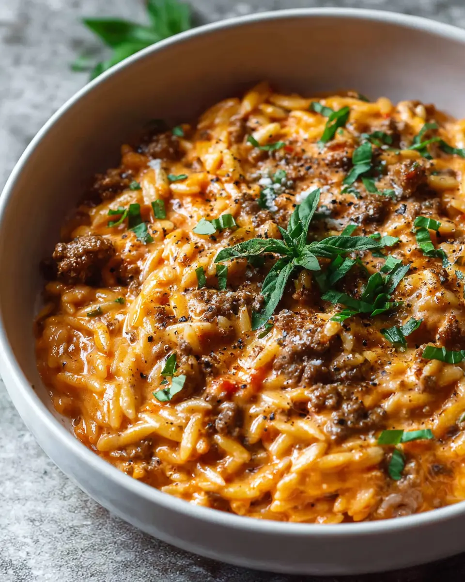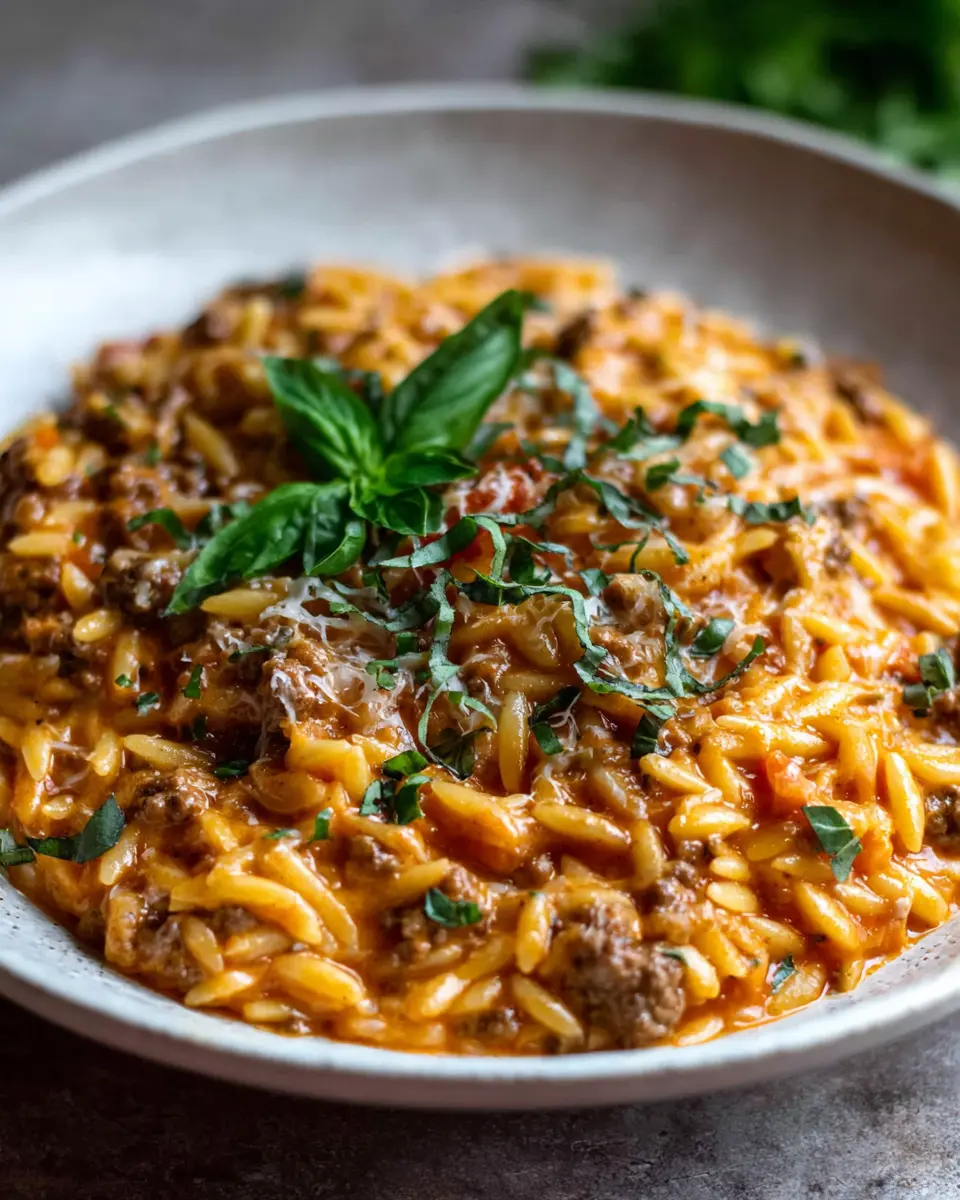 Ground Beef Orzo with Tomato Cream Sauce and Fresh Basil