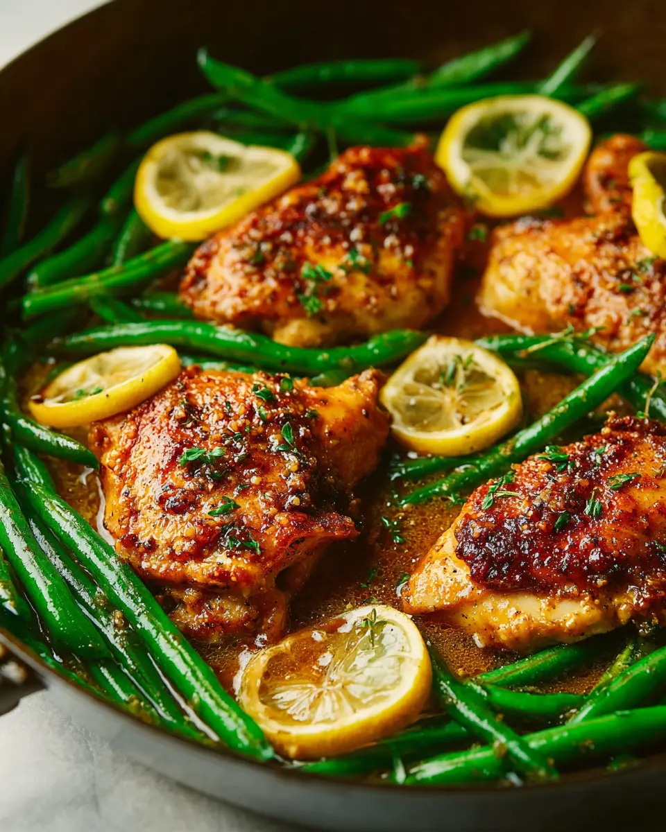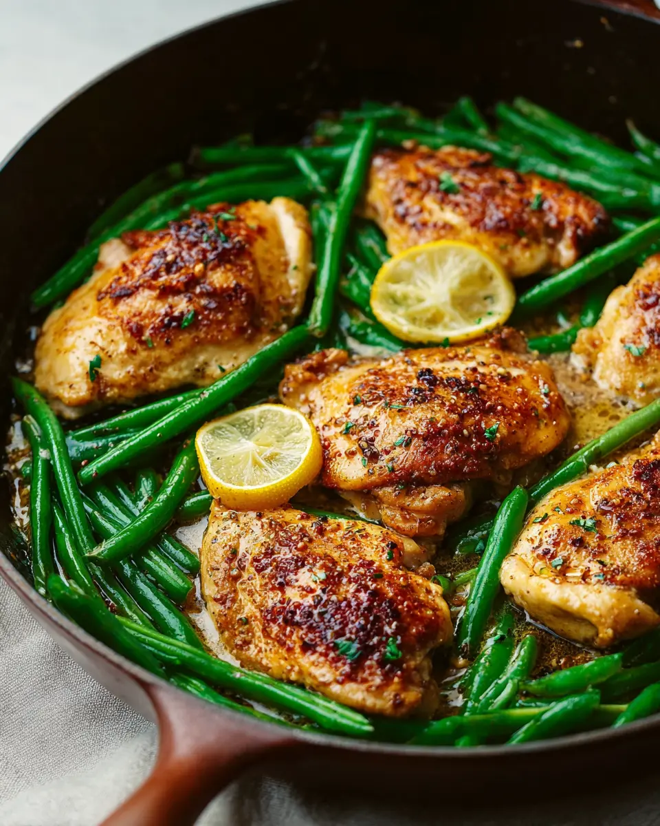 The magic happens in about 25 minutes. Your skillet will be bubbling away, bringing together tender chicken thighs and vibrant green beans, all infused with a zesty lemon garlic butter sauce.