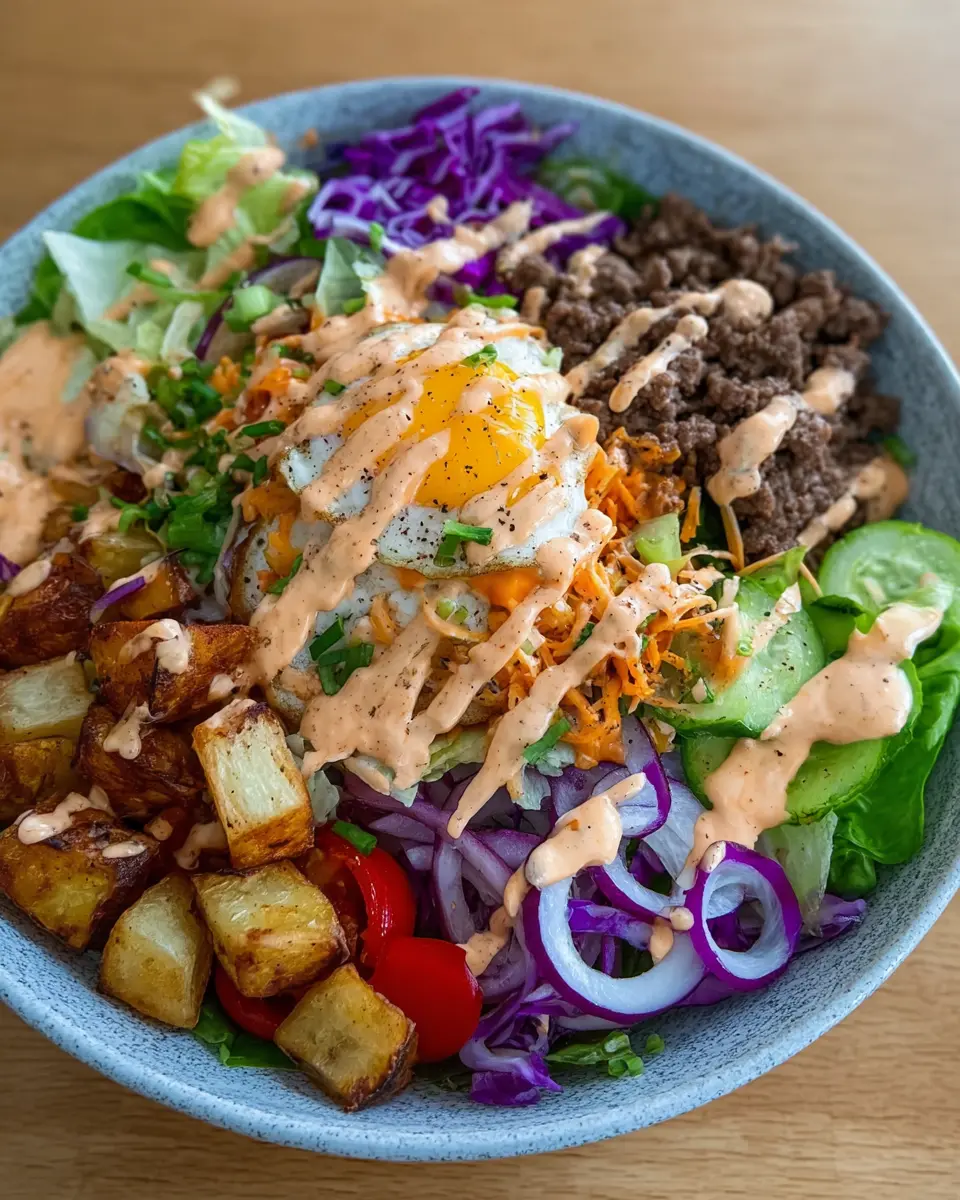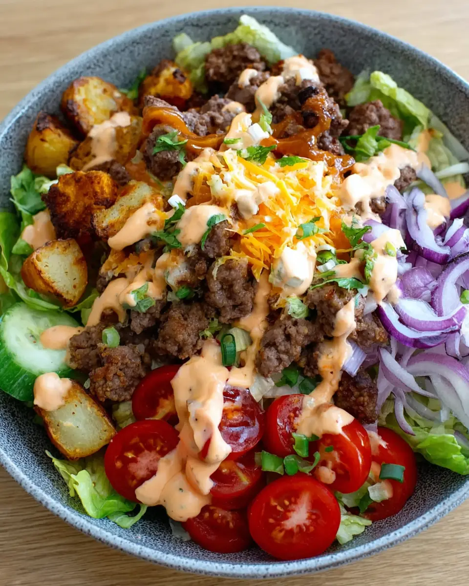 Now comes the fun part—layering everything together! Start by dividing the lettuce among four bowls. On top of that, add your crispy baked potatoes and savory beef mixture. Sprinkle shredded cheese over the top, then add cherry tomatoes, red onion slices, and gherkins for that finishing touch. Drizzle your homemade burger sauce generously over everything, and voilà! Dinner is ready to serve.