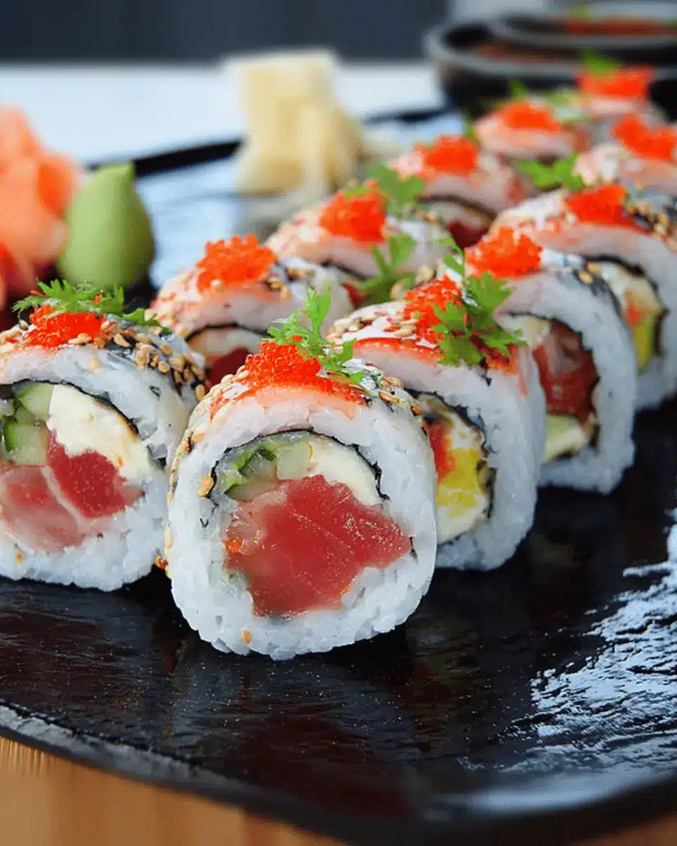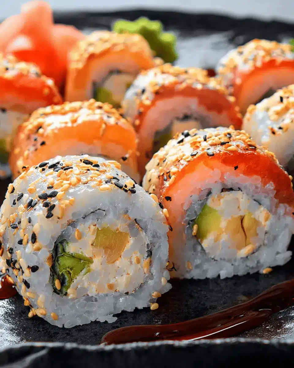 - Accompaniments: Don’t forget soy sauce, wasabi, sushi ginger, and optional roasted white sesame seeds for added crunch.