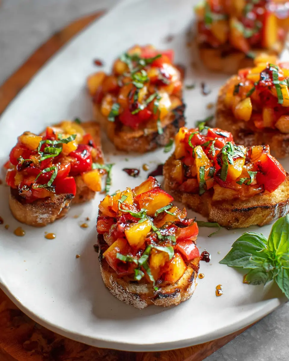 Serving my favorite peach bruschetta at gatherings? Make it a fun DIY station! Set out bowls of toppings, like extra herbs, chopped olives, or even spicy turkey bacon bits, inviting guests to customize their crostini. You can also layer your bruschetta ingredients in jars for a stunning presentation at a picnic. Want to make it a more substantial meal? Serve on a bed of mixed greens or alongside creamy polenta for a delightful twist!