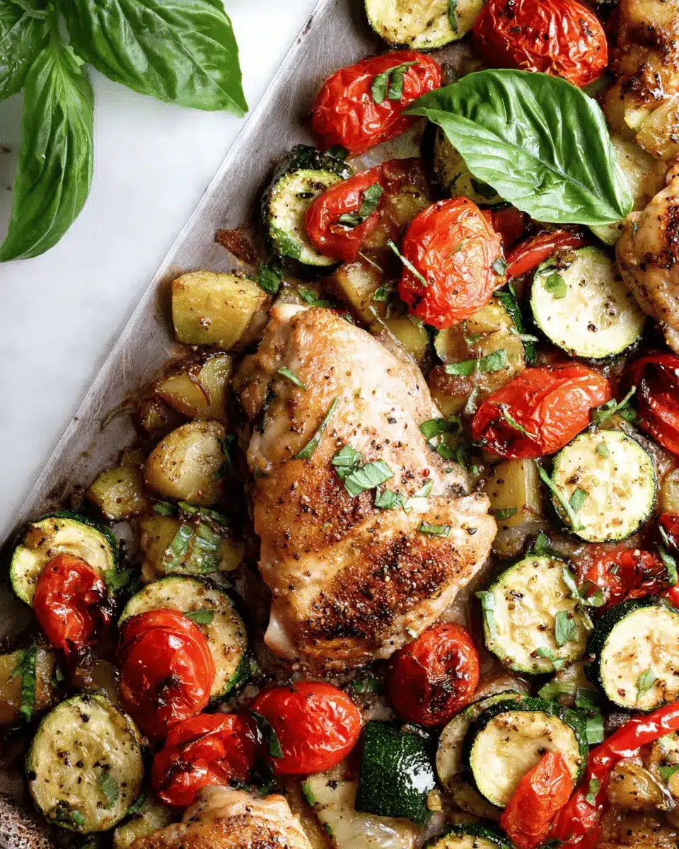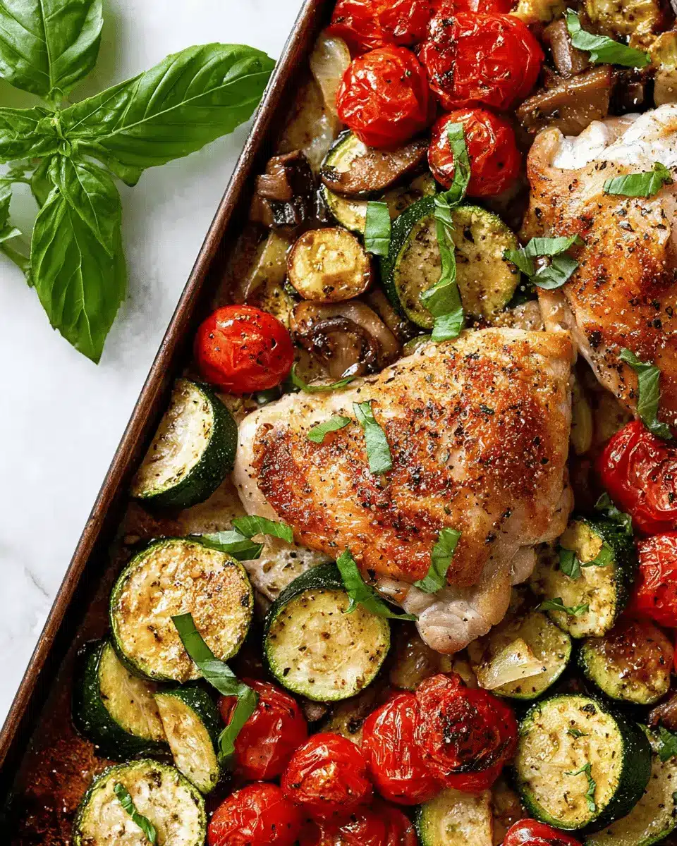 Sheet Pan Chicken with Zucchini Tomatoes and Basil
