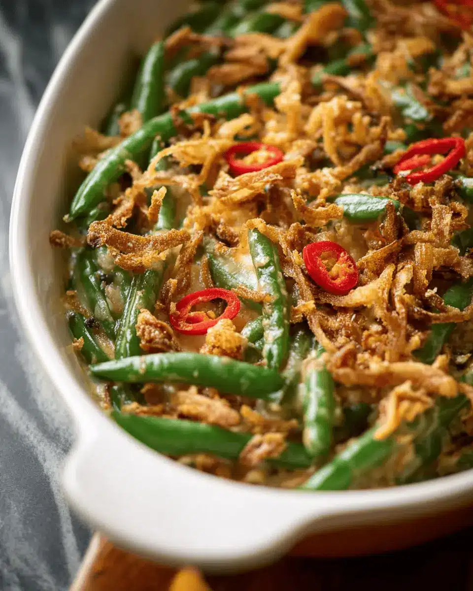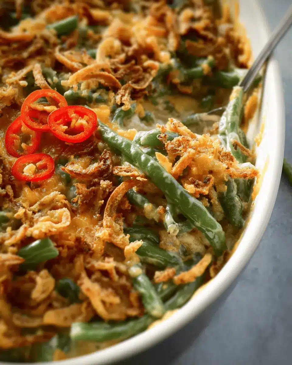 This spicy green bean casserole is perfect for a variety of occasions! It shines at holiday gatherings, potlucks, or family dinners when you want to add a twist to a classic dish. Consider bringing it to a barbecue or picnic as a side that sparks conversation and intrigue. It’s also a delightful option for cozy weeknight dinners, especially when you’re looking to impress your guests with something unique. The excitement from those first bites will have everyone asking for the recipe! Whether it’s a chilly fall evening or a festive gathering, this dish fits right in.
