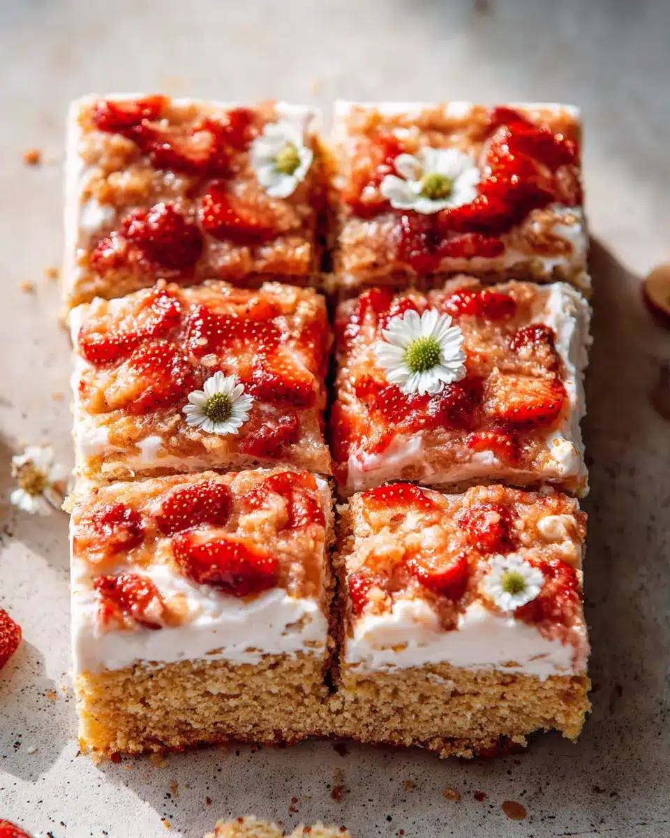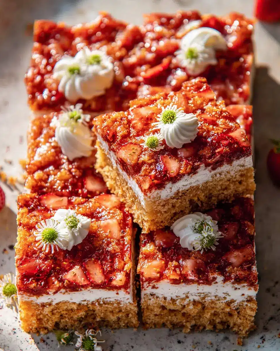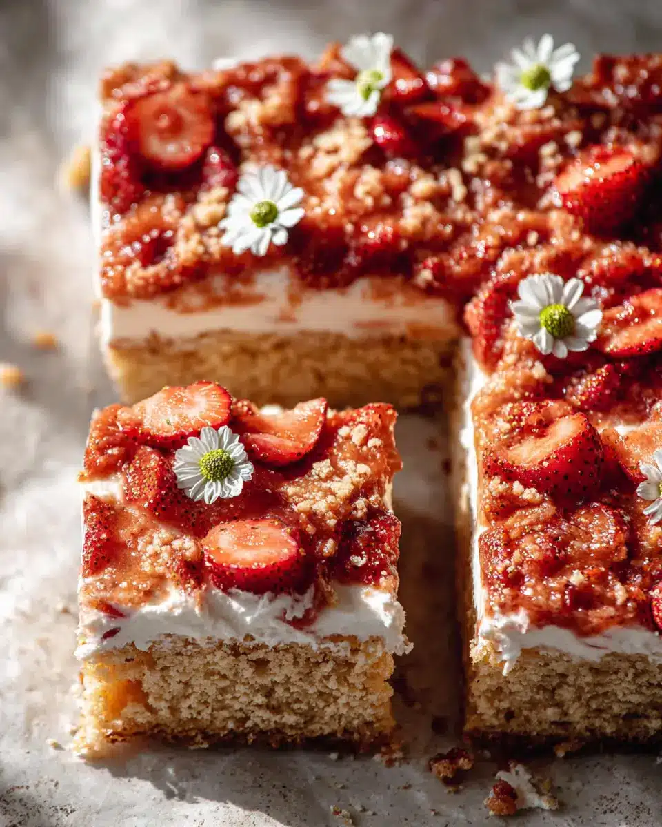 Now, slice your Strawberry Shortcake Sheet Cake, serve it, and watch everyone enjoy your delicious creation! This cake is perfect for birthdays, gatherings, or simply as a sweet treat to brighten up your day. Happy baking!