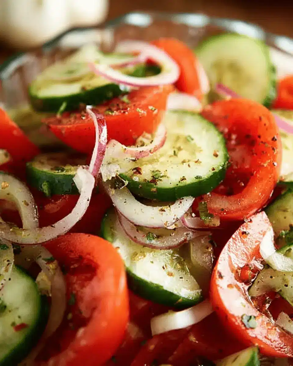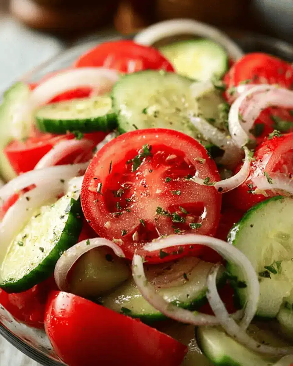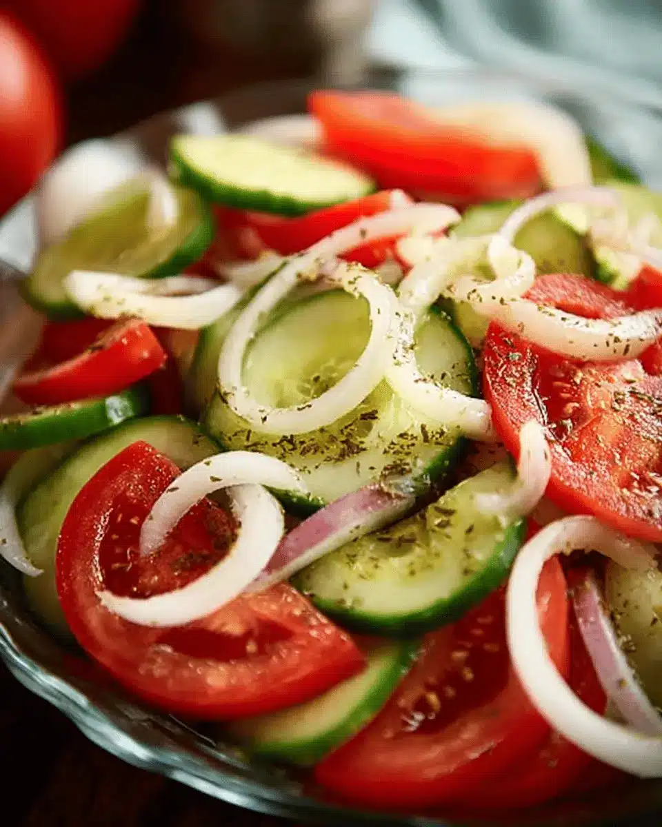 One of the best things about this salad is its versatility. You can enjoy it as a light lunch, a picnic dish, or a simple side at a barbecue. Plus, it’s perfect for meal prep—just toss it together in advance and let the flavors meld in the fridge. The combination of ripe tomatoes, crunchy cucumbers, and zesty onions creates a delightful crunchy texture that’s oh-so-satisfying.