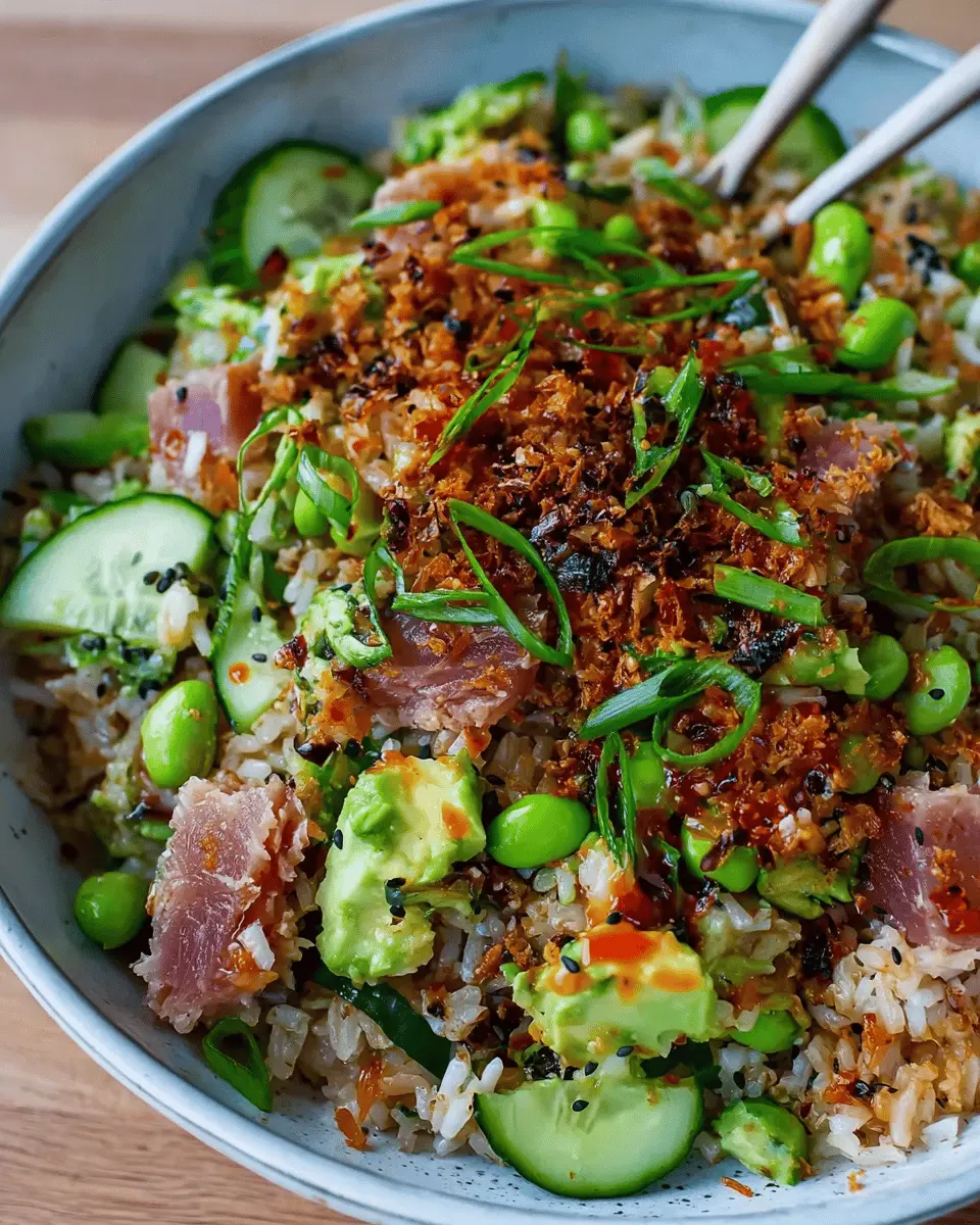 Absolutely! You can prepare many components of your tuna avocado crispy rice salad ahead of time. The crispy rice can be made a few days in advance and stored in an airtight container to maintain its crunch. You can also whip up the dressing ahead of time and store it in the fridge for up to a week. Just remember to add the fresh ingredients, like avocado and cucumbers, right before serving to keep them fresh and vibrant.