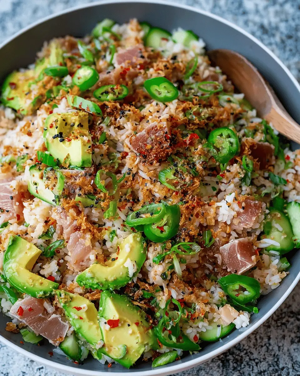 Once your crispy rice is ready and cooled slightly, it’s time to bring everything together! Gently fold the tuna and veggie mix into the bowl of crispy rice. Drizzle that zesty dressing over everything, then add a bit of spice with chili crisp or sriracha oil, and top with those jalapeño slices if you dare! Give it a gentle toss to ensure everything is well mixed but be careful not to break the crispy rice too much.