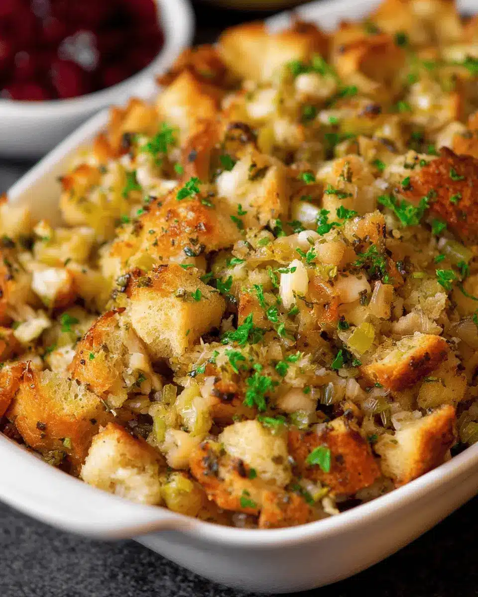 Vegetable Sides: Pair it with garlic mashed potatoes or honey-glazed carrots for a delightful contrast. The creamy textures balance the stuffing's hearty breadcrumbs perfectly.
