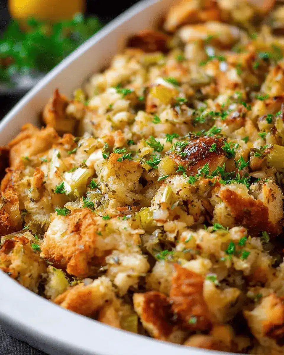 Bake your stuffing at 350°F (175°C) for 30 minutes, covered. After that, remove the foil and let it bake for an additional 10-20 minutes until the top is golden brown and crispy. This crispy topping is what many look forward to the most, so don’t rush this step! Serve immediately, garnished with a sprinkle of fresh parsley if you like.