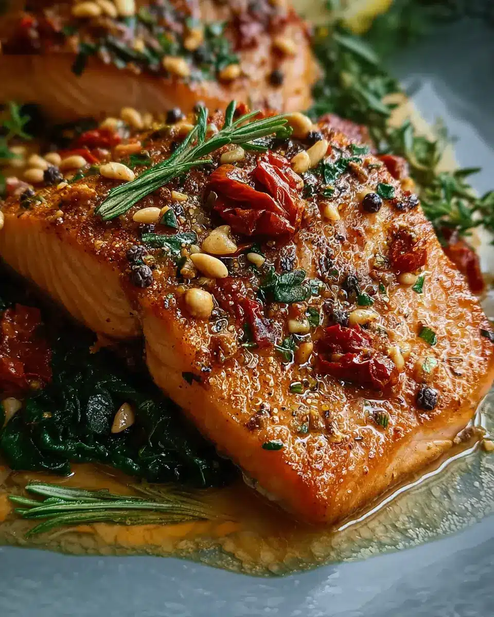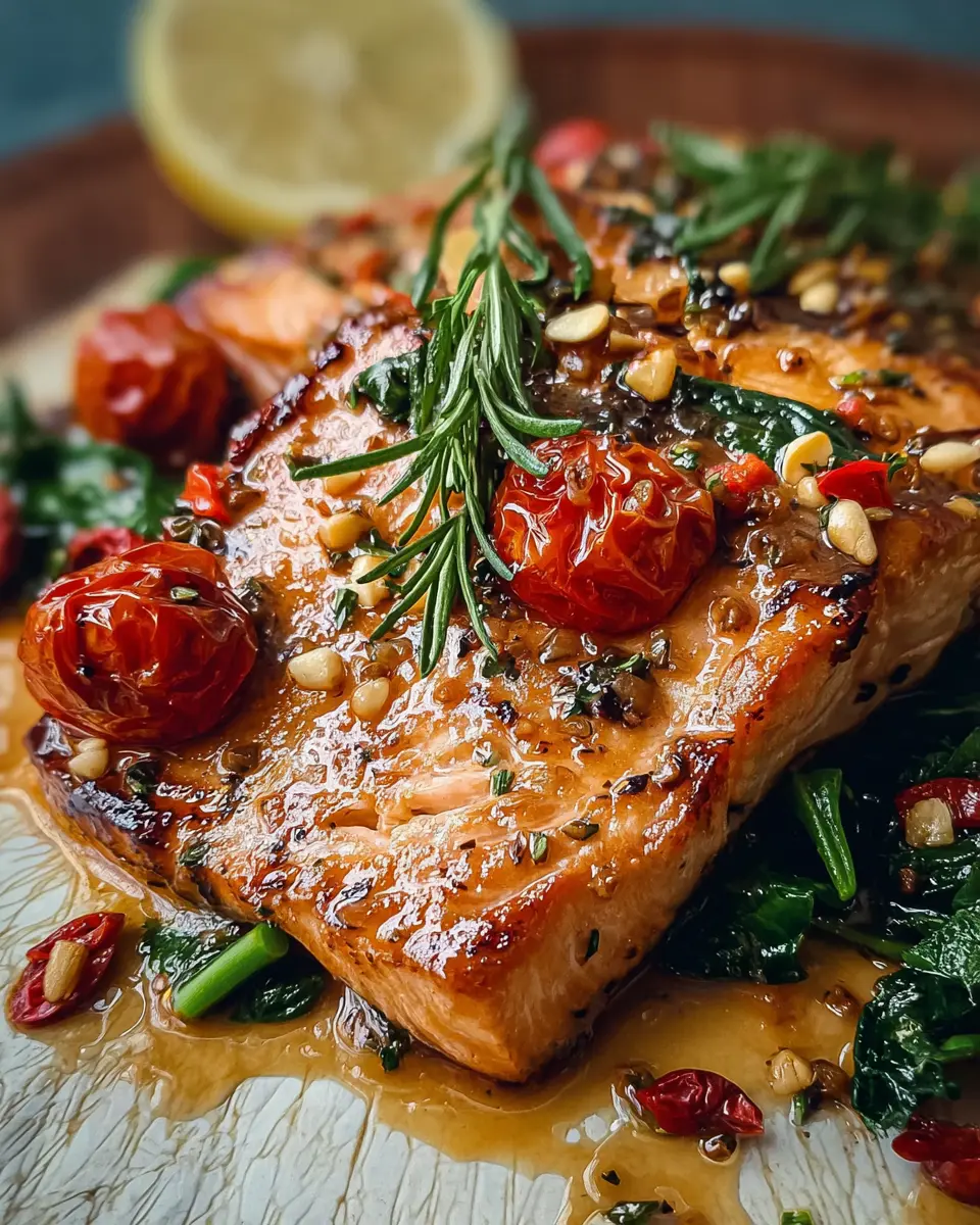 For a beautiful presentation, garnish your Tuscan Salmon with lemon slices and fresh rosemary sprigs. If you're feeling fancy, sprinkle some lightly toasted pine nuts on top for added crunch. And just like that, your Tuscan Salmon is ready to excite your taste buds!