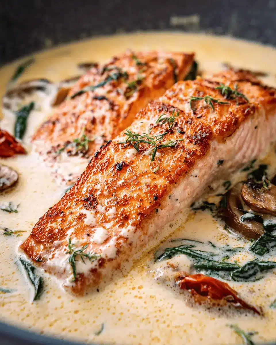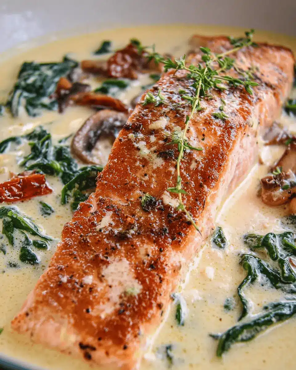 Imagine serving a plate that showcases beautifully golden salmon, nestled in a luxurious Parmesan cream sauce. The marriage of sun-dried tomatoes and fresh spinach adds both color and taste, making this dish as pleasing to the eyes as it is to the palate.