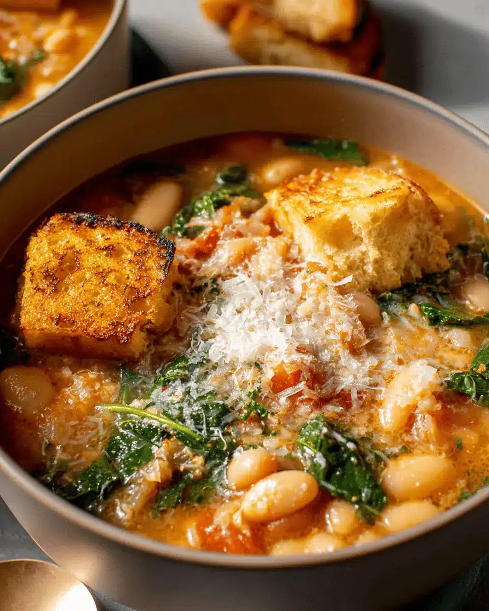 Finally, it’s time to serve your Tuscan White Bean Soup! Ladle the warm soup into bowls and don’t forget to top it with your homemade croutons. Simply cube some stale bread, drizzle with olive oil, and bake until golden. This adds a delightful crunch to each spoonful! For an extra hit of flavor, you can garnish it with freshly grated parmesan cheese. Enjoy the comforting, luscious goodness with a side of crusty bread to soak it all in!